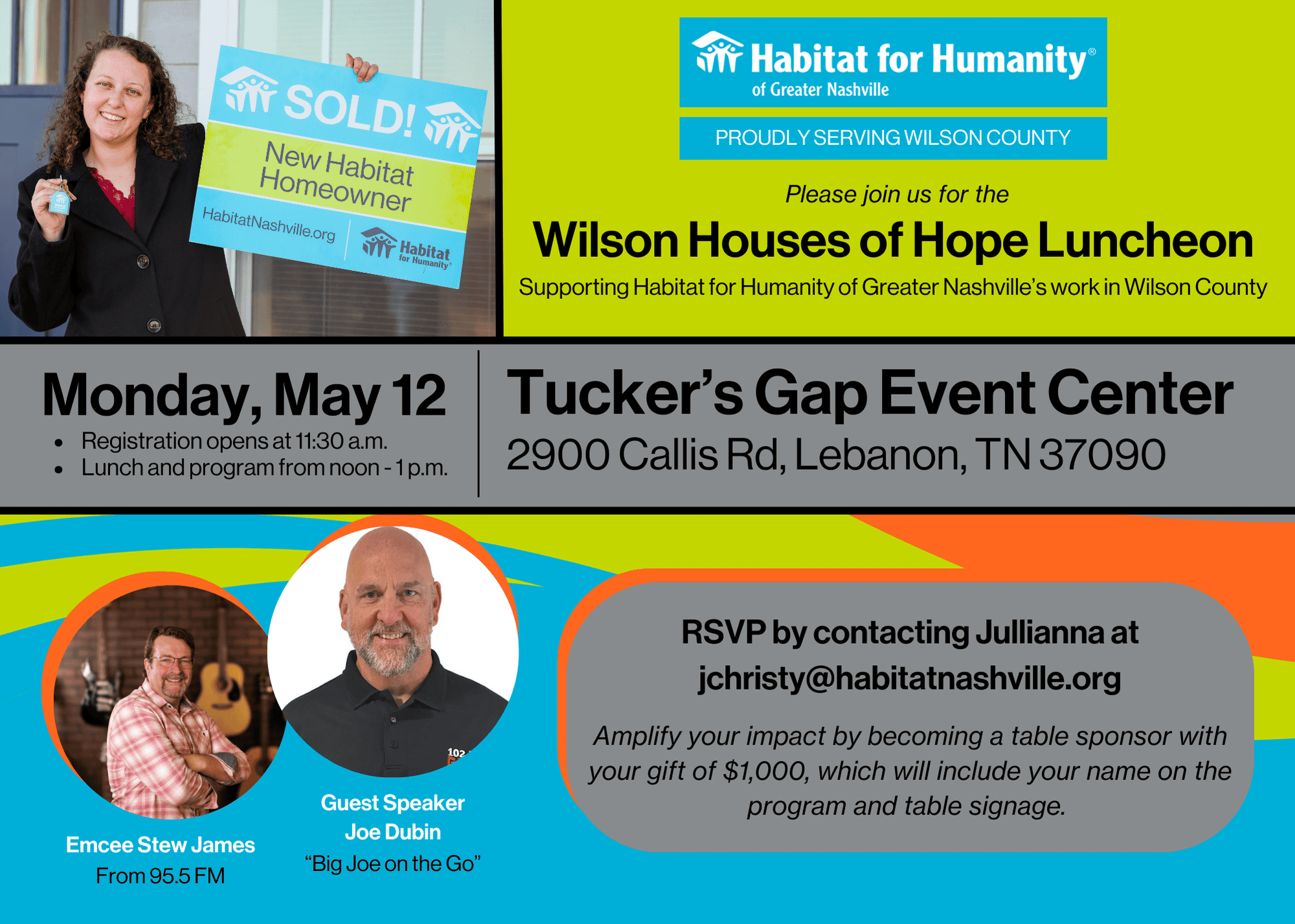 Tucker's Gap 2900 Callis Road, Lebanon, United StatesJoin us for the Wilson County Houses of Hope Luncheon supporting Habitat for Humanity of Greater Nashville! Date: Monday, May 12 Time: 11:30 a.m. Registration, Noon-1 p.m. Lunch and Program Location: Tucker's Gap Event Center, 2900 Callis Rd., Lebanon, TN 37090 Enjoy inspiring stories, delicious food, and great company while making a difference in Wilson County.…